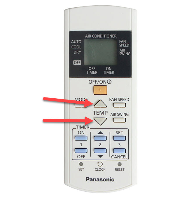 Bước 1: Bạn chỉ cần nhấn đồng thời vào 2 nút mũi tên lên và xuống ở nút SET hoặc dấu cộng (+) và trừ (-) trên điều khiển. (Tùy mỗi dòng máy sẽ đi kèm với những thiết kế điều khiển khác nhau)